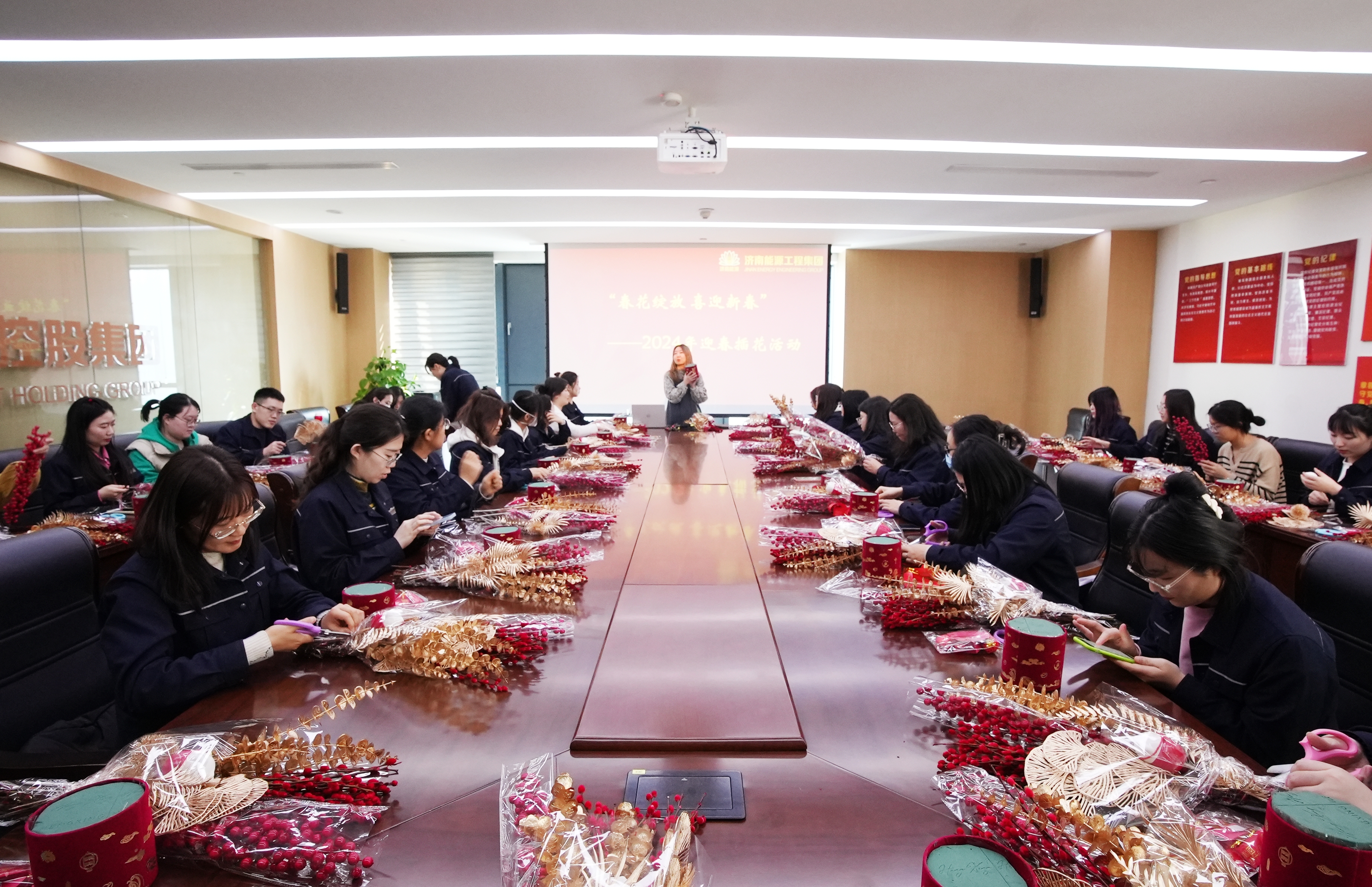 活动现场,花艺老师向大家讲解了年宵花福桶的寓意和制作方法,“福桶”代表着万事顺遂、阖家幸福,寄予了新的一年充满希望与喜悦。大家相互配合、积极参与,将一支支花材插入福桶,并根据自己的喜好调整花枝舒展的方向,用心制作出属于自己的独一无二的福桶。活动最后,大家把制作好的福桶挂上一串串红彤彤的“福”卡、“平安”卡等挂件,许下最美好的新年愿望。现场气氛热烈融洽,为即将到来的新年增添了一抹亮色。